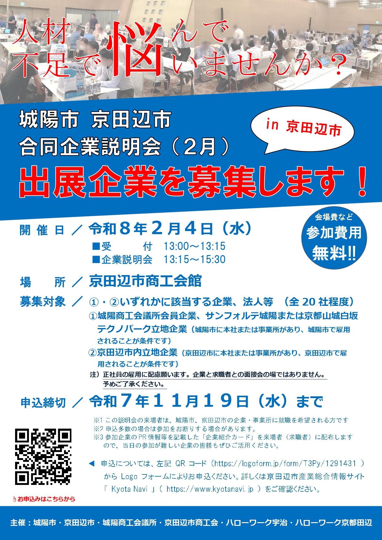 就職希望者と城陽市、京田辺市の企業のマッチングの場として、企業説明会を開催いたします。参加企業を募集しておりますので、貴社の魅力をPRする機会として、ぜひご活用ください!