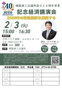 下記のとおり、城陽商工会議所設立40周年事業 記念経済講演会を開催いたします。