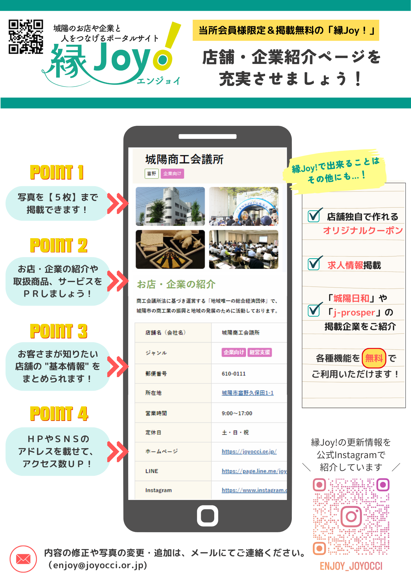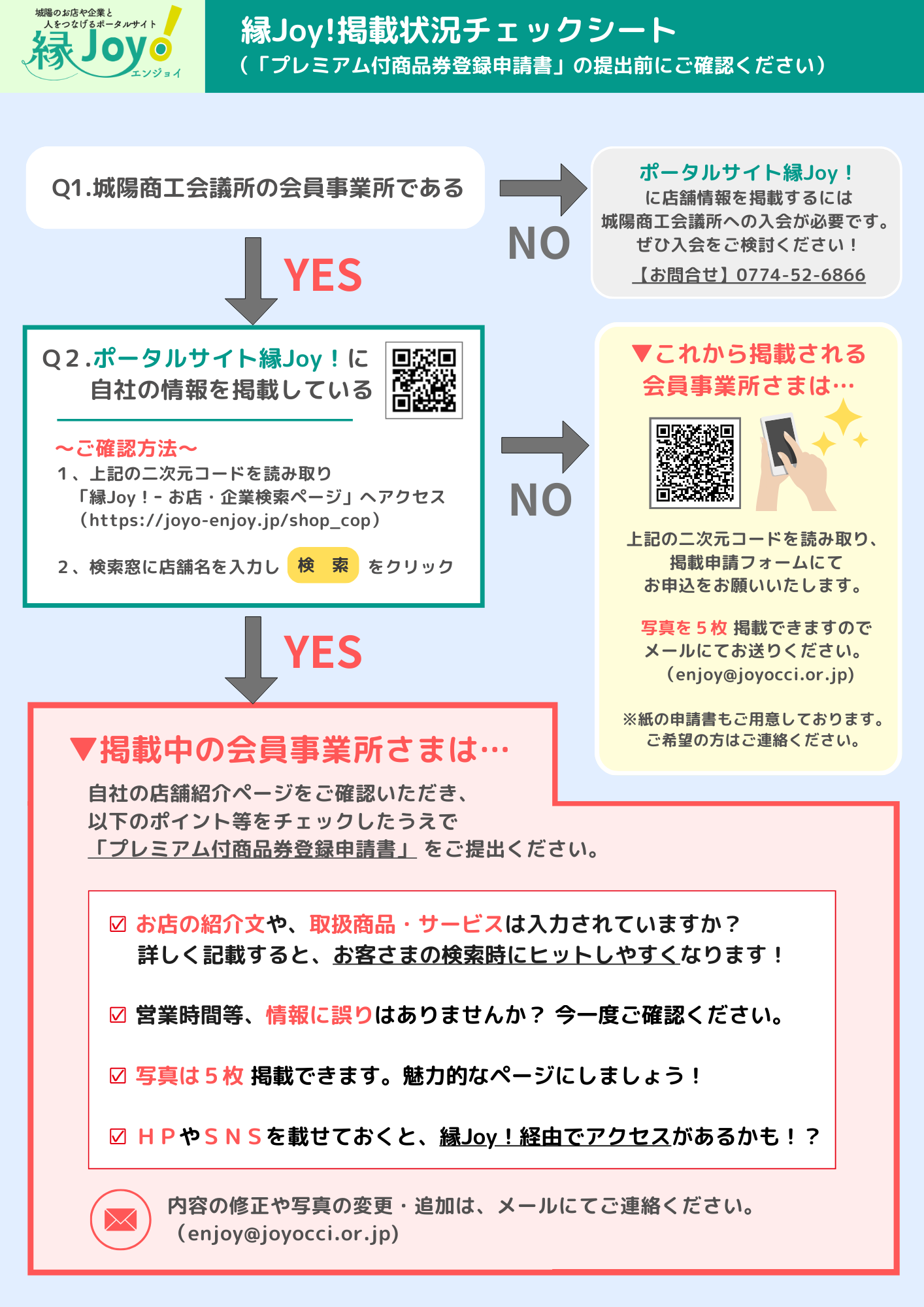 城陽市プレミアム付商品券2026取扱店舗を、ポータルサイト「縁Joy!」にてご紹介いたします。掲載状況チェックシートを参照のうえ、内容のご確認をお願いいたします。