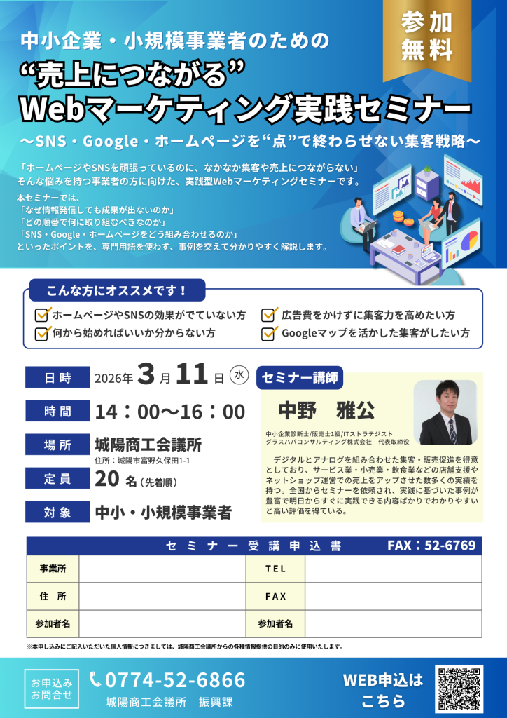 そんな悩みを持つ事業者の方に向けた、実践型Webマーケティングセミナーです。